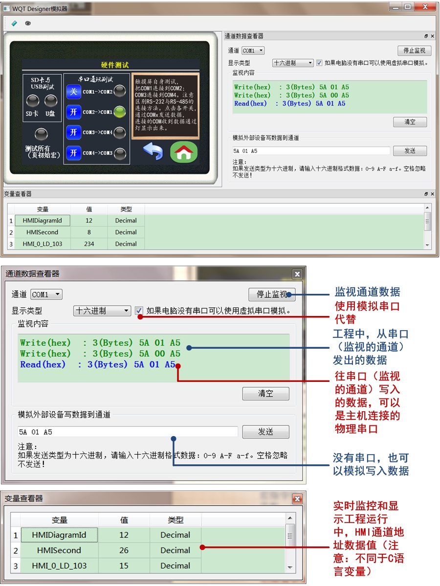 WQT Designer 具有強(qiáng)大的模擬仿真功能,PC端的模擬器,也相當(dāng)于一個PC版本的人機(jī)界面,搭配PC機(jī)物理串口,也可操作PLC、串口模塊等。使用串口的組態(tài)功能時,用戶甚至不需要購買觸摸屏,利用PC機(jī)模擬器,也可將工程先做完,再買觸摸屏設(shè)備。